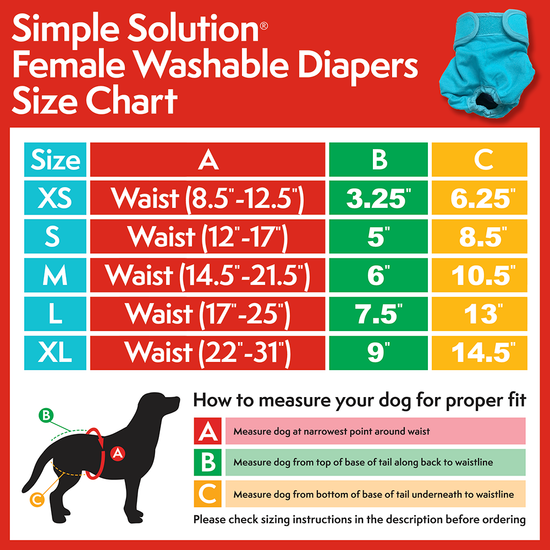 TAILORED TO FIT - Simple Solution Small Washable Dog Diaper is for female dogs a waist size of 12-17 inches. For optimal fit, measure your dog's waist near her hind legs and refer to our new and improved sizing chart.