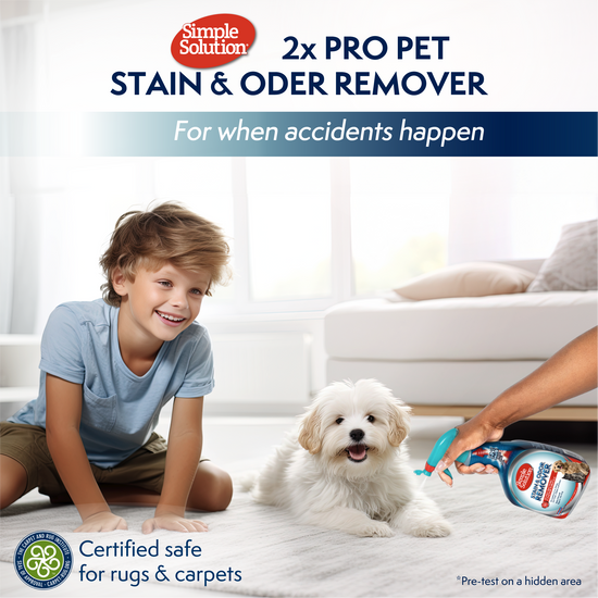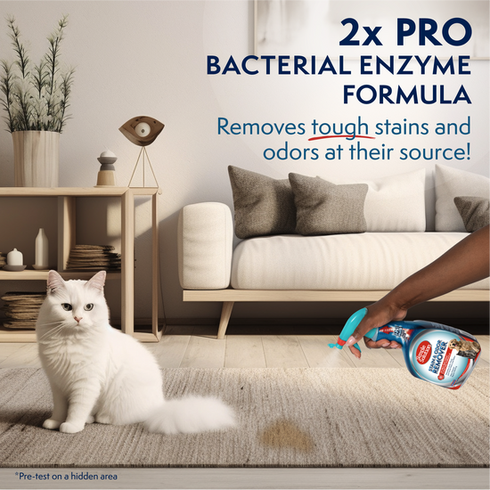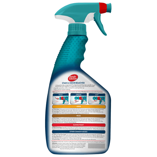 - Safely removes dog and cat stains and odors from carpet, upholstery, bedding, fabric toys, clothing, and other water-safe surfaces in your home.
