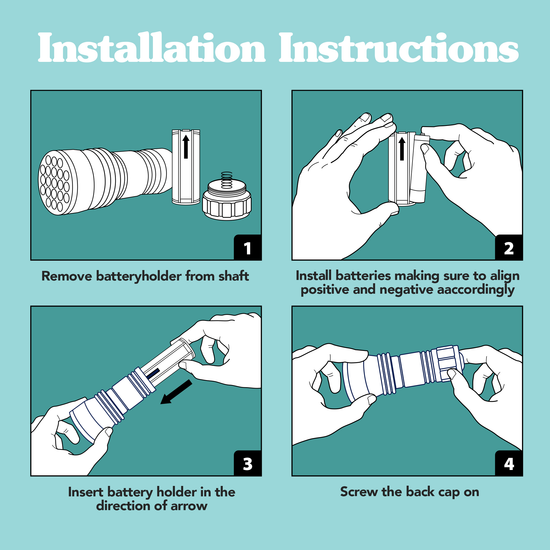 For best results, the room should be as dark as possible. Turn on the flashlight using the rubber end button on the back of the cap. Shine the flashlight on carpet, rug or furniture material to reveal the urine. Battery Installation: Remove cap from flashlight. Remove battery housing from flashlight and place on table with arrow facing downward. Place batteries in housing with the (-) negative side facing the spring. Place housing back into flashlight with arrow facing downward. Replace cap.