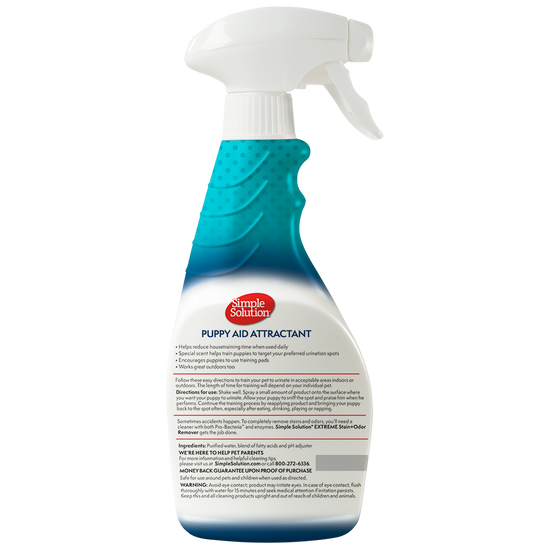 Shake well. Spray a small amount of product onto the surface where you want your puppy to urinate. Allow your puppy to sniff the spot and praise him when he performs. Continue the training process by reapplying product and bringing your puppy back to the spot often, especially after eating, drinking, playing or napping.